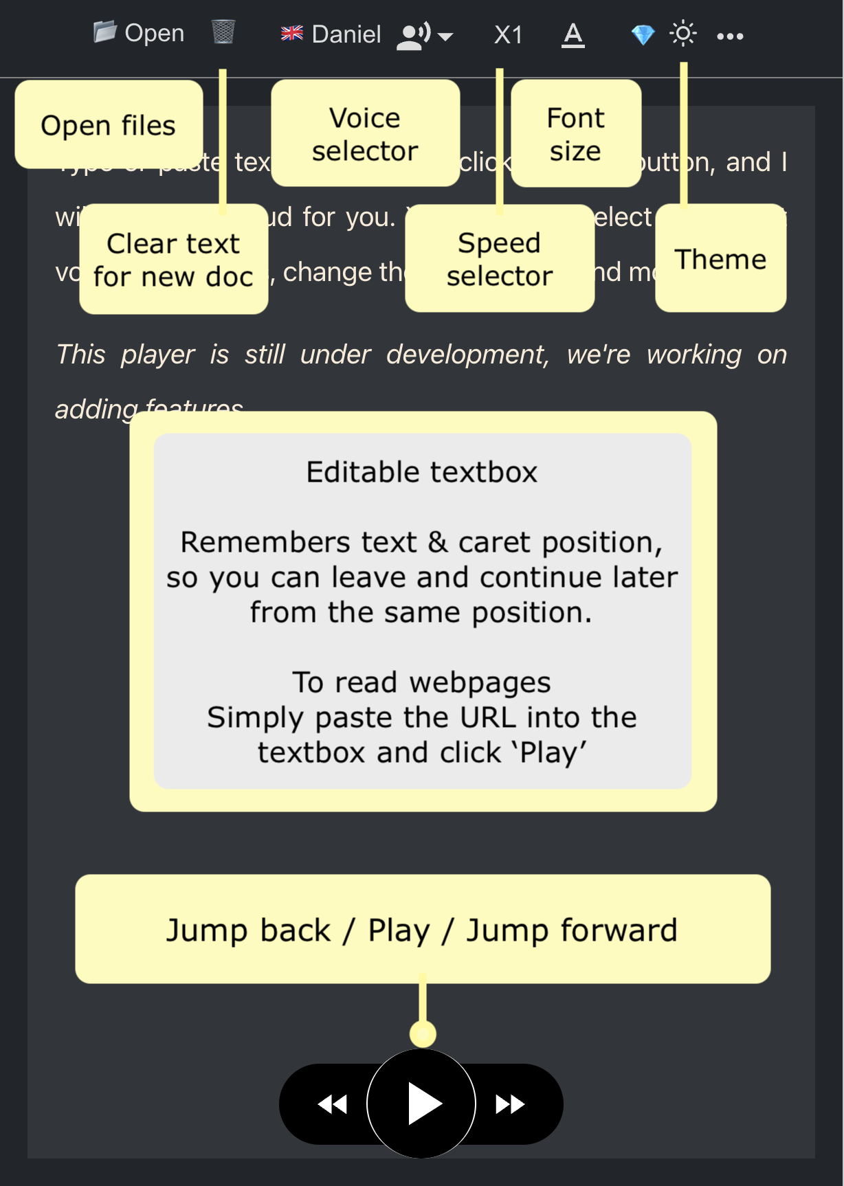 अगले दृश्य में आपके पास एक टेक्स्ट बॉक्स होगा, जहां आप अपना स्वयं का टेक्स्ट इनपुट कर सकते हैं या शीर्ष पर बटनों का उपयोग करके फ़ाइल चुन सकते हैं। जब आप तैयार हों, तो नीचे 'प्ले' बटन पर क्लिक करें और सुनने का आनंद लें।
