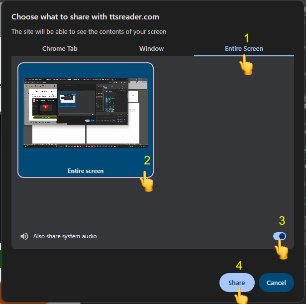 Once you click the following button a popup will show. There select the 'Entire Screen' & 'Also share system audio' options. Finally, click 'Share'.
